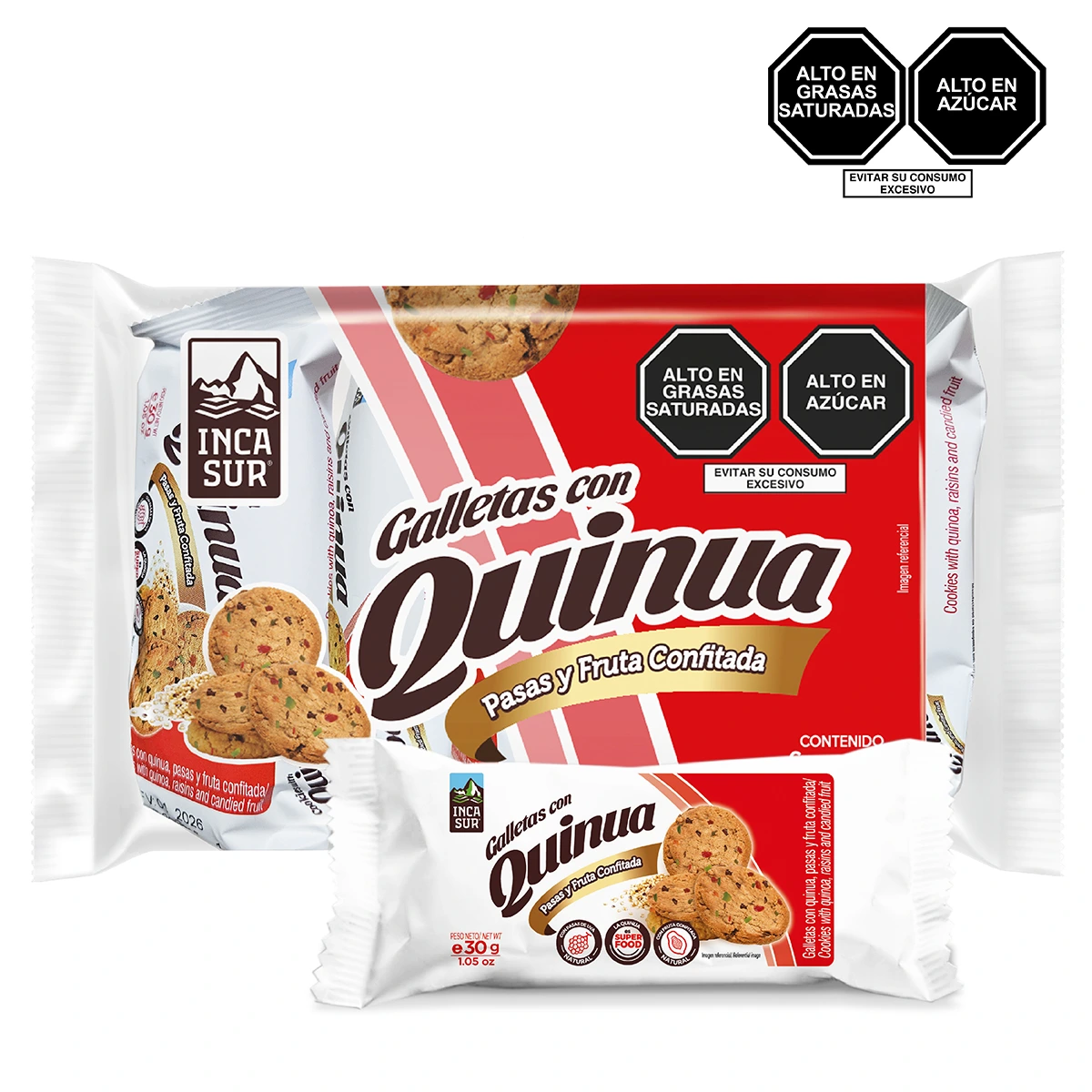 Deliciosas Galletas elaboradas con quinua, pasas y fruta confitada, un snack rico y nutritivo para cualquier momento del día. Prueba Galletas IncaSur en todas sus variedades.
