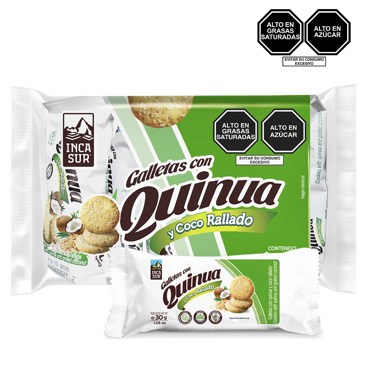 Deliciosas Galletas elaboradas con quinua y coco rallado, un snack rico y nutritivo para cualquier momento del día. Prueba Galletas IncaSur en todas sus variedades.